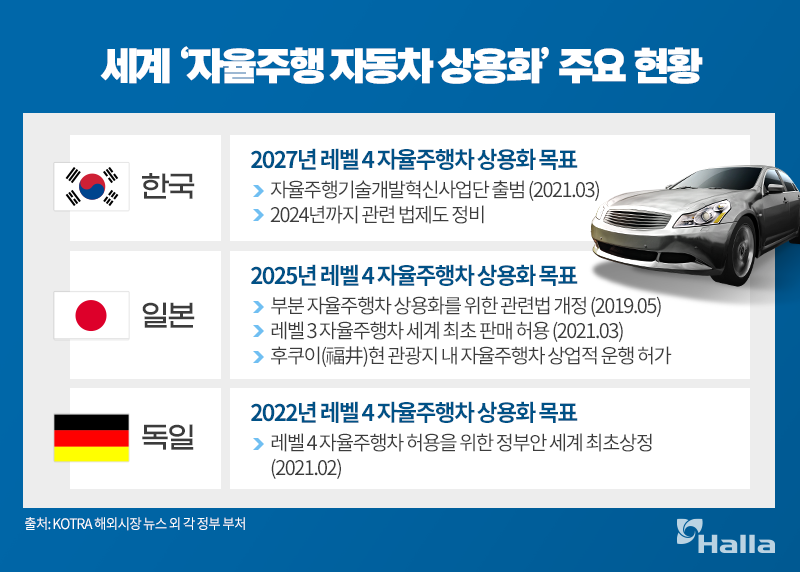 먼저 우리나라는 지난 2019년 레벨 4 자율주행차의 상용화 시기를 2030년에서 2027년으로 앞당겼습니다. 세계 최초로 완전 자율주행 상용화 기록을 통해 국제 표준과 미래차 시장을 선점하기 위해서죠. 더불어 올해 ‘자율주행기술개발혁신사업단’을 출범하며 법 정비에 나섰습니다.