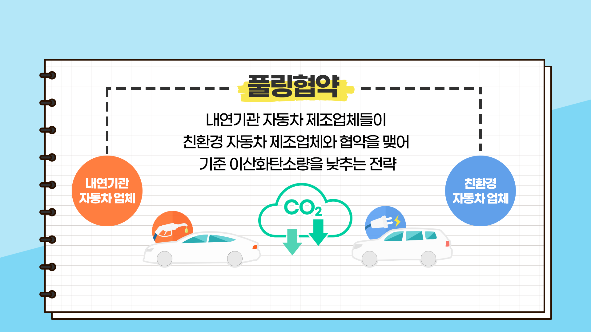 일부 완성차 업체는 친환경 자동차 업체와 ‘풀링(pooling)협약’으로 동맹 관계를 구축하고 있습니다. 하나의 제조사로 탄소 배출량을 집계해 세금 폭탄을 피하는 방법이죠.