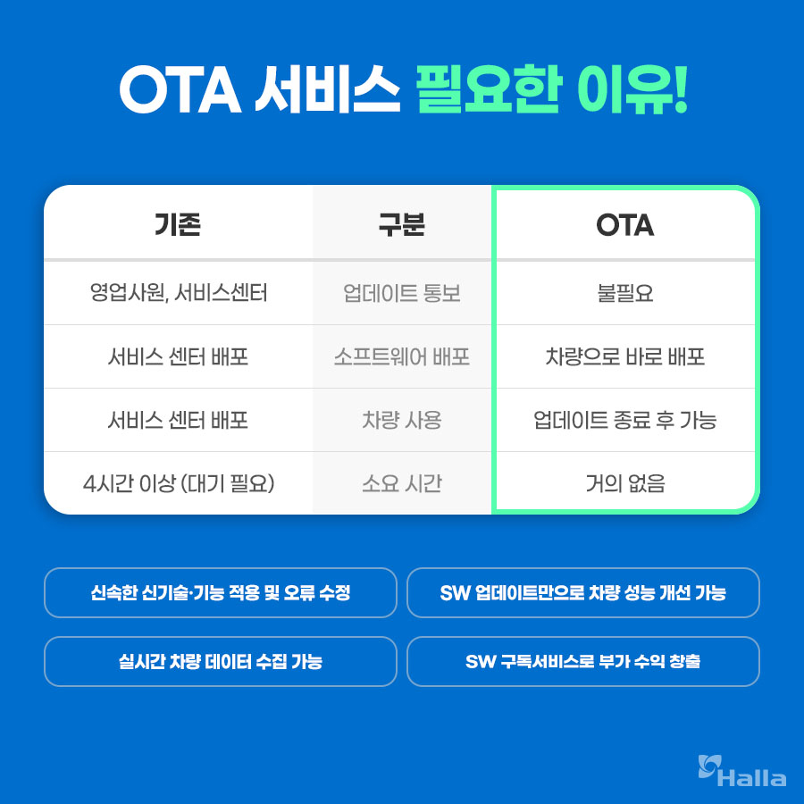 스마트폰을 최신 소프트웨어로 업데이트하기 위해 서비스 센터를 방문하는 사람은 없습니다. 터치 한 번이면 알아서 업데이트되기 때문입니다. 그런데 왜 자동차는 그럴 수 없는 것일까요? 이러한 의문에서 등장한 것이 ‘OTA’입니다. OTA란 스마트폰처럼 자동차 소프트웨어를 무선 통신 기술로 업데이트하는 기술을 의미합니다.