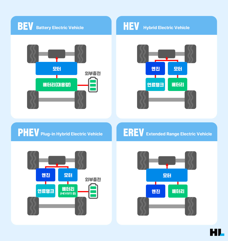 하나가 더 있습니다. 앞에서 말씀드렸던 ‘전기차 판매 통계’에는 숨어 있는 함정이 있습니다. 우리 나라는 순수 배터리 전기차의 통계를 주로 사용하는 반면, 다른 나라에서는 충전할 수 있는 전기차, 즉 플러그인 전기차를 뜻하는 경우가 대부분입니다. 즉, 순수 배터리 전기차(BEV) 뿐만 아니라 플러그인 하이브리드 전기차(PHEV)와 주행 거리 연장형 전기차(EREV)도 포함되는 것입니다.
