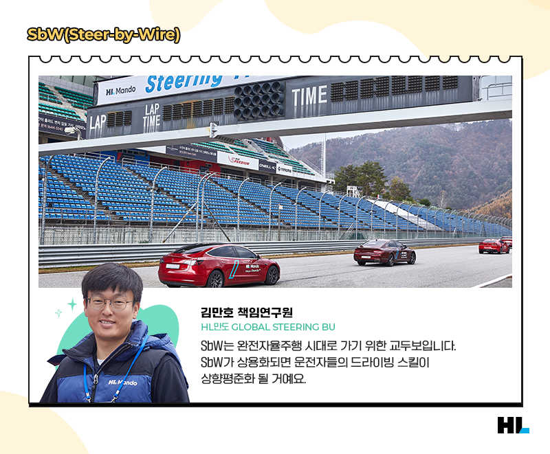 스티어링 트랙데이에서 많은 눈길을 끈 세션이 바로 SbW(Steer-by-Wire)인데요. SbW는 전기신호로만 핸들(조향 휠)과 바퀴를 연결하는 전기 신호식 조향 시스템입니다. 물리적 연결을 없앤 자유로운 레이아웃과 높은 설계 자유도 등 다양한 장점을 지닌 것이 특징인데요. HL만도는 이번 트랙데이를 통해 운전자가 직접 SbW의 장점을 체험할 수 있도록 세션을 구성했습니다.